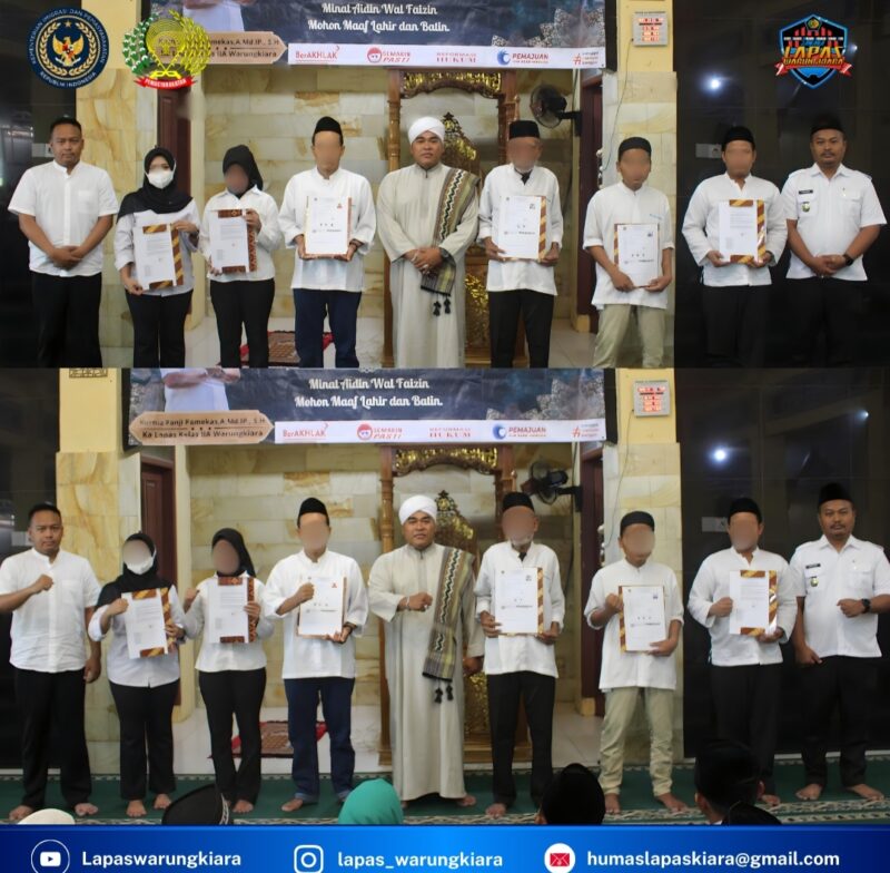 Kabarjournalist.com – Warungkiara – Bertempat di Masjid Al Himayah, Kalapas Warungkiara serahkan SK Remisi Hari Raya Idul Fitri ke perwakilan Warga Binaan , Senin (31/03/2025).